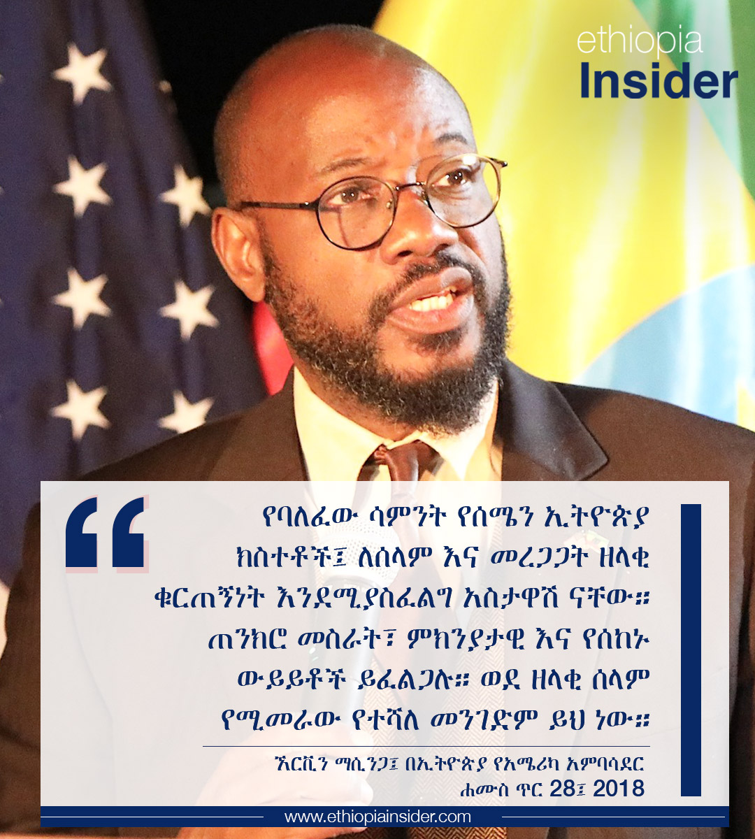 ማሲንጋ ይህንን ያሉት፤ በኢትዮጵያ የአሜሪካ ኤምባሲ የማህበራዊ ትስስር ገጾች ዛሬ ሐሙስ ጥር 28፤ 2018 በተሰራጨ መልዕክታቸው ነው። የአምባሳደሩ መልዕክት በመከላከያ ሰራዊት እና በትግራይ ኃይሎች መካከል ጸለምት/ጠለምት በተባለው አካባቢ በተፈጠረ ግጭት ያንዣበበው ውጥረት የመርገብ አዝማማሚያ ማሳየቱን ተከትሎ የተሰጠ ነው።